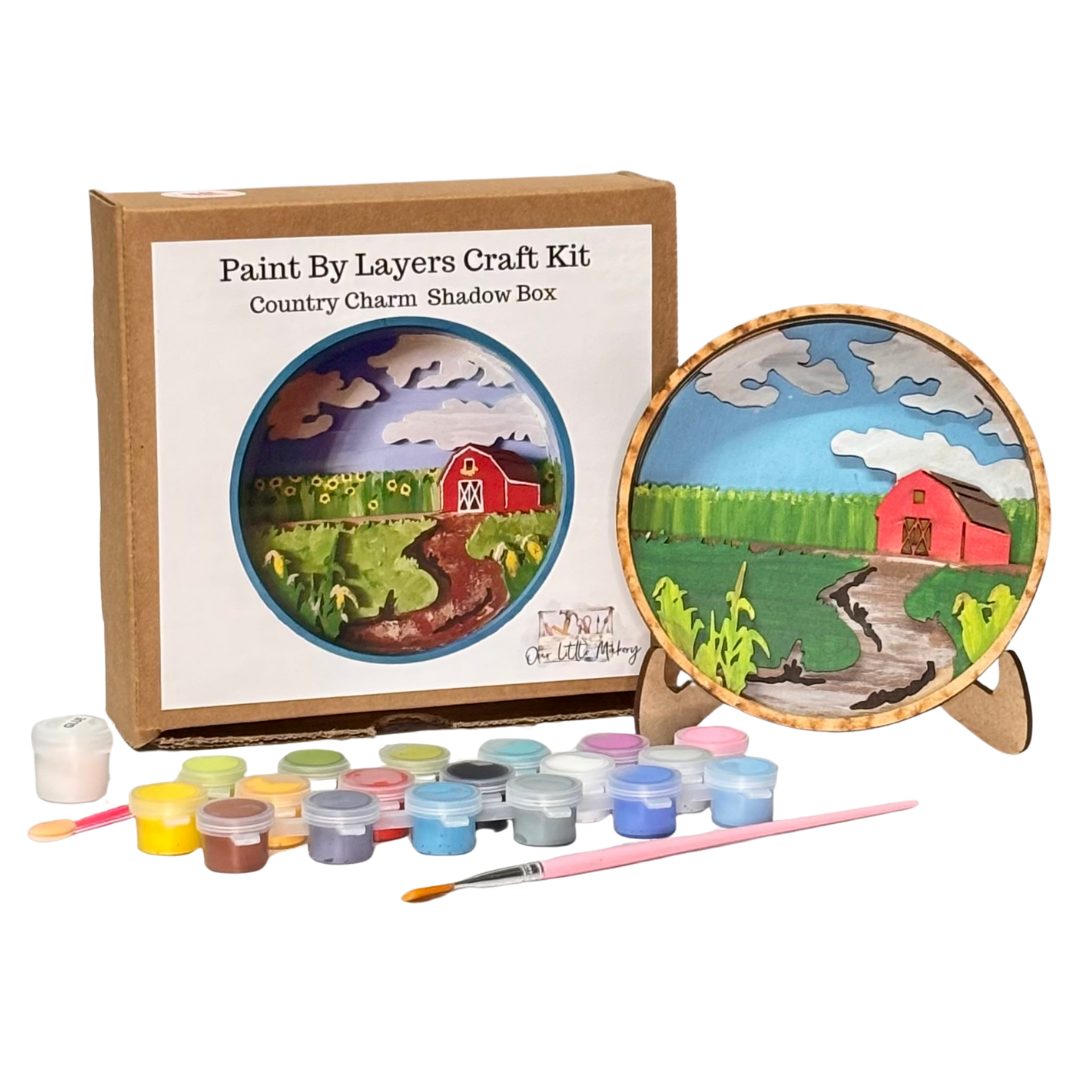 Bring a touch of rustic life to your craft table with the Country Charm Paint by Layers – Shadow Box Kit, featuring a classic barn, sunflower field, and winding dirt path. A peaceful and nostalgic scene for anyone who loves the charm of farm life.
