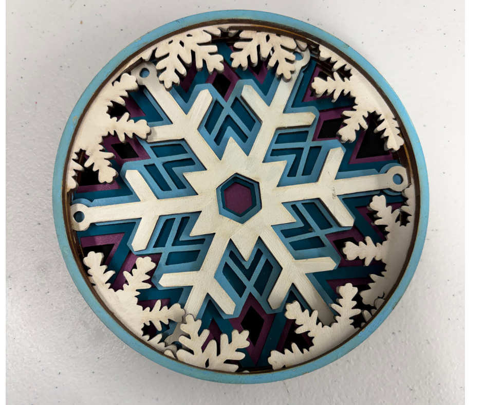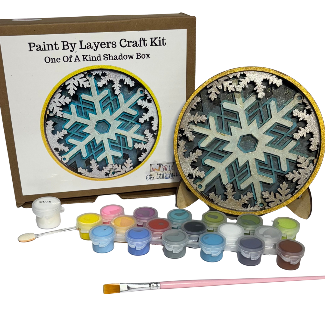 Create a striking winter décor piece with this intricately layered snowflake design, One Of A Kind Paint By Layer – Shadow Box Kit. Precision-cut pieces stack to form a dimensional centerpiece framed by a bold circular border. Simply paint, assemble, and enjoy a unique handmade creation perfect for seasonal displays or gifting.