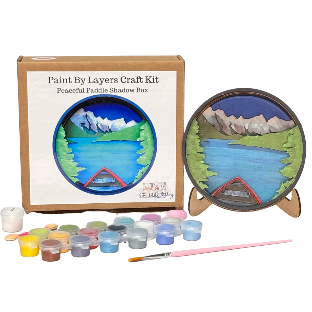 Drift into calm waters with the Peaceful Paddle Shadow Box Kit, a tranquil lakeside scene designed for mindful making. Each painted layer invites stillness, serenity, and a moment of escape.