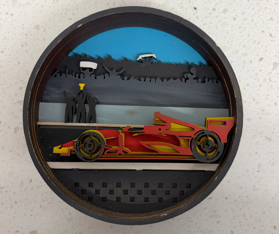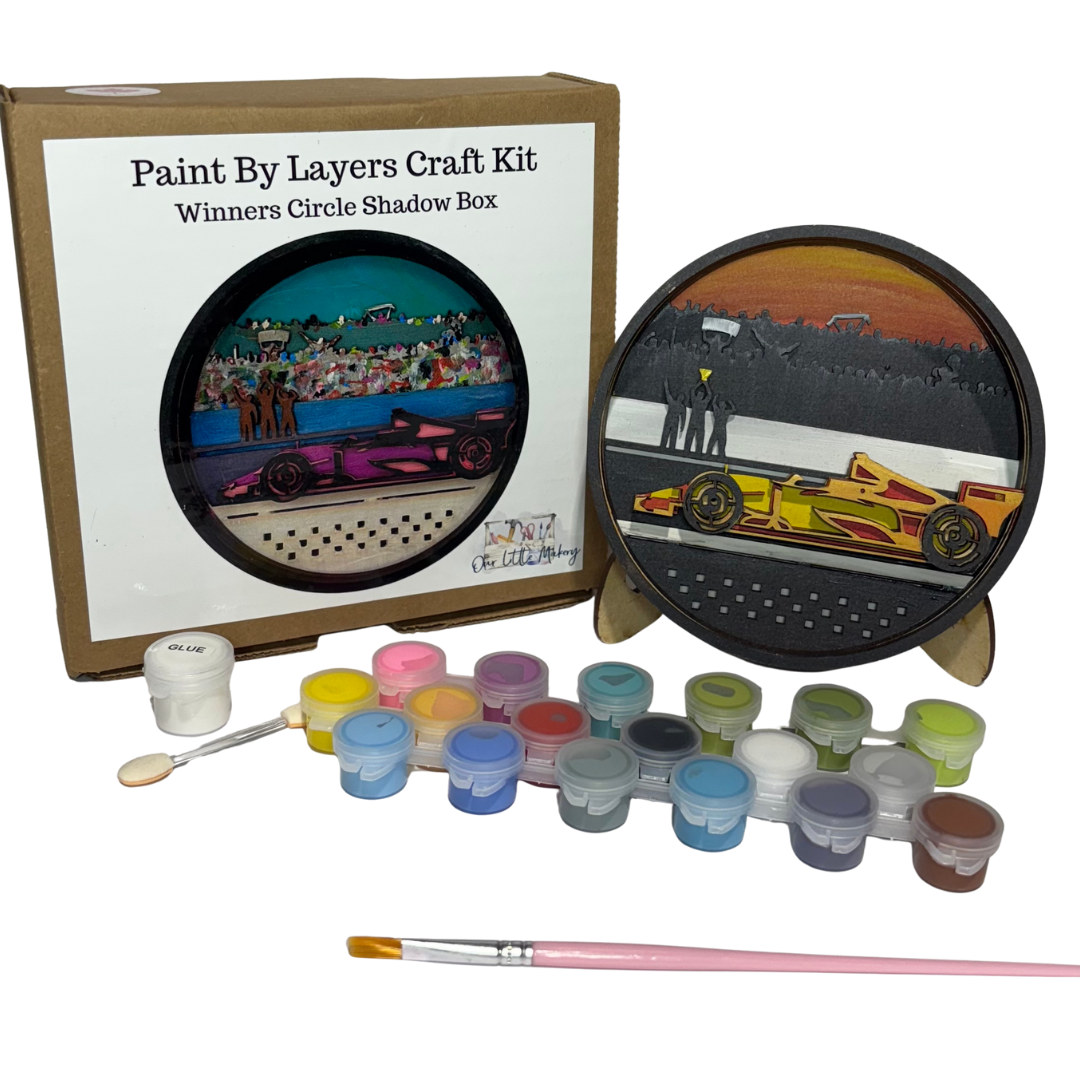 Feel the rush with the Winner’s Circle Shadow Box Kit, where a sleek race car crosses the finish line to roaring cheers. This high-energy design brings the thrill of motorsport to your craft table—your victory lap in layered form.